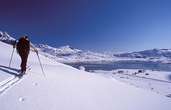 En général, les départs en ski de randonnée se font depuis la route. Pour cette première prise de contact avec la neige norvégienne, nous nous rendons à Flakstadoya.. Ce village nous offre un spectacle contrasté : de superbes aiguilles de granit crépies de neige comme le Stortinden (856 m) dominent une eau turquoise style « Caraïbes » bordée de plages de sable fin. Ici les repères habituels explosent assez vite… Depuis le hameau de Bo (le bien nommé) où nous collons nos peaux de phoque, une pente douce mène à un col proche du Moltinden, puis au sommet du Flakstadtinden. La descente sur Flakstad et sa plage balnéaire est vraiment royale. A Rambert, petit village voisin, nous rencontrons nos premiers pêcheurs qui étalent leurs morues sur de grands racks.